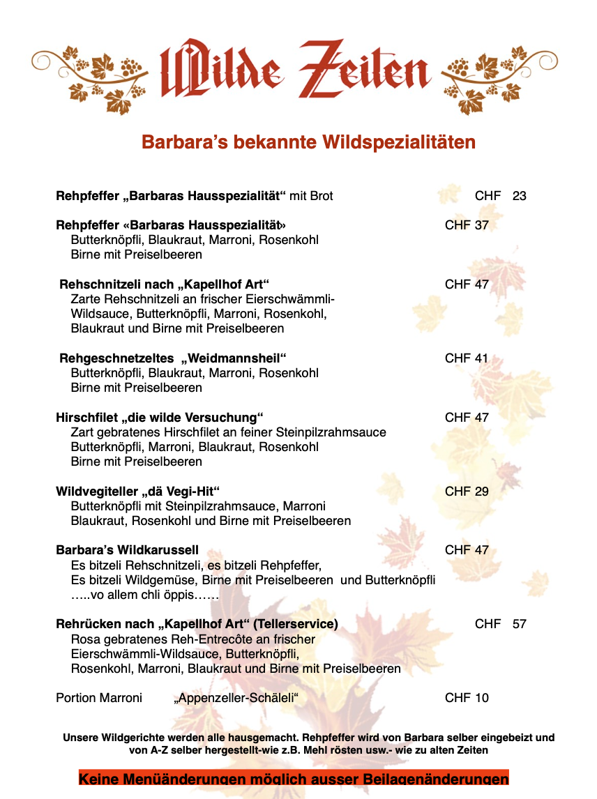 Gasthaus Kapellhof in Tuggen is a true culinary gem, renowned for its authentic Swiss gastropub experience. The menu shines brightest with Barbara's famed wild game specialties, such as the tender Rehpfeffer served with butter-knöpfli, blaukraut, marroni, and rosenkohl. Each dish is a harmonious blend of rich, rustic flavors, perfectly complemented by seasonal sides like pear with lingonberries.