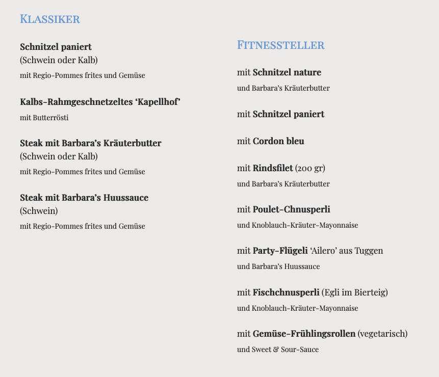 The Rehschnitzeli nach Kapellhof Art stands out—delicately pan-seared venison cutlets paired with fresh chanterelle wild sauce and traditional accompaniments, delivering an unforgettable depth of taste. Guests consistently praise the balance between hearty, housemade comfort foods and refined preparation. Customer feedback highlights not only the exceptional food quality but also the attentive, friendly service that elevates the dining experience.